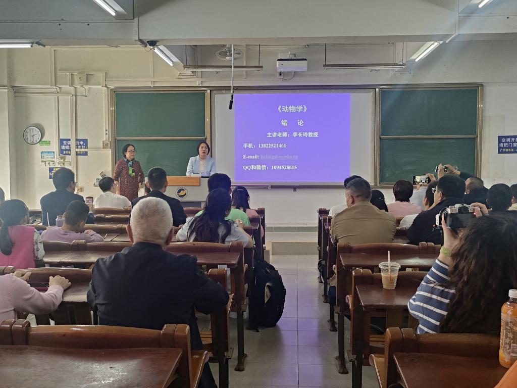 授课环节,李长玲教授精神饱满地登上讲台。她从教39年,此次再度执起粉笔,为在座校友重启知识之门。授课过程中,她并未局限于教材,而是以清晰的逻辑与生动的讲述,系统梳理了动物学的核心范畴与研究脉络,并深刻阐释了其与水产科学的内在联系。校友们全神贯注,或凝神聆听,或提笔记录,重新体验了学生时代的课堂氛围。当课程结束,掌声如潮水般涌起,经久不息。