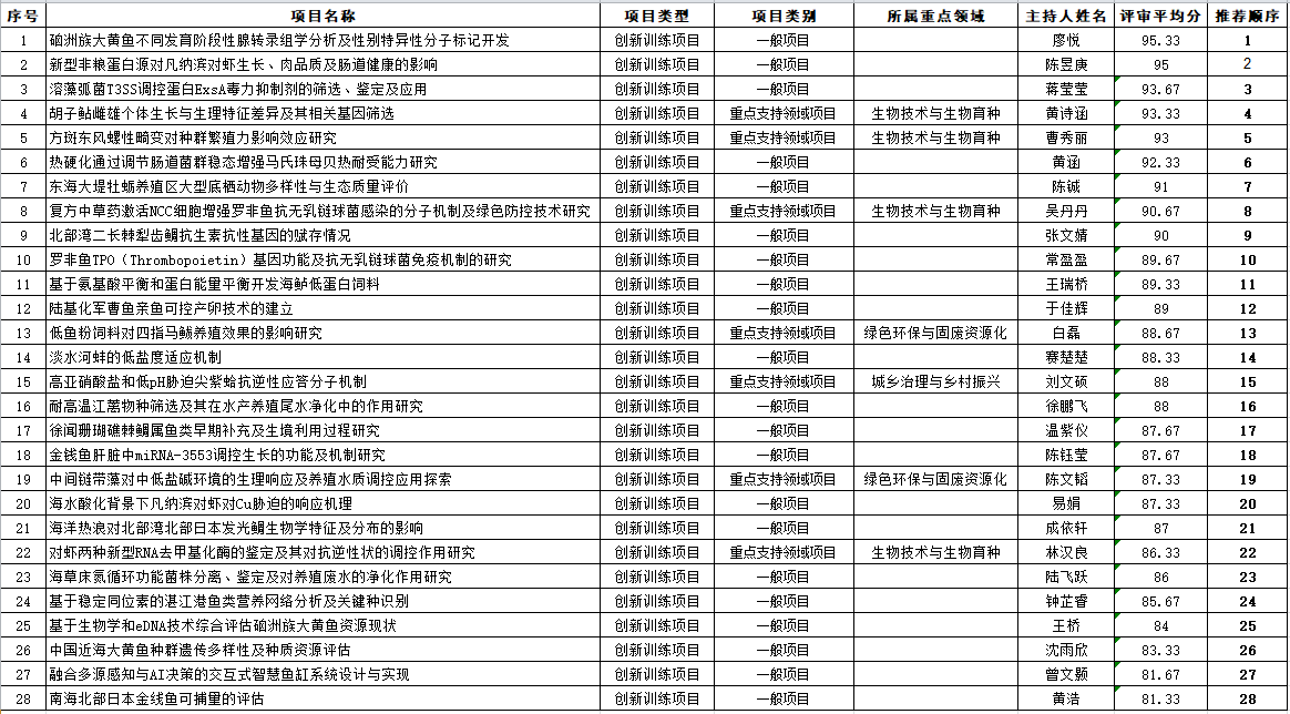 经学生申报、导师审核、学院进行资格核查,共有28项符合申报条件。经专家对所申报项目进行评审,评分从高到低排序并按序推荐,现将拟推荐顺序公示(详见附表)。