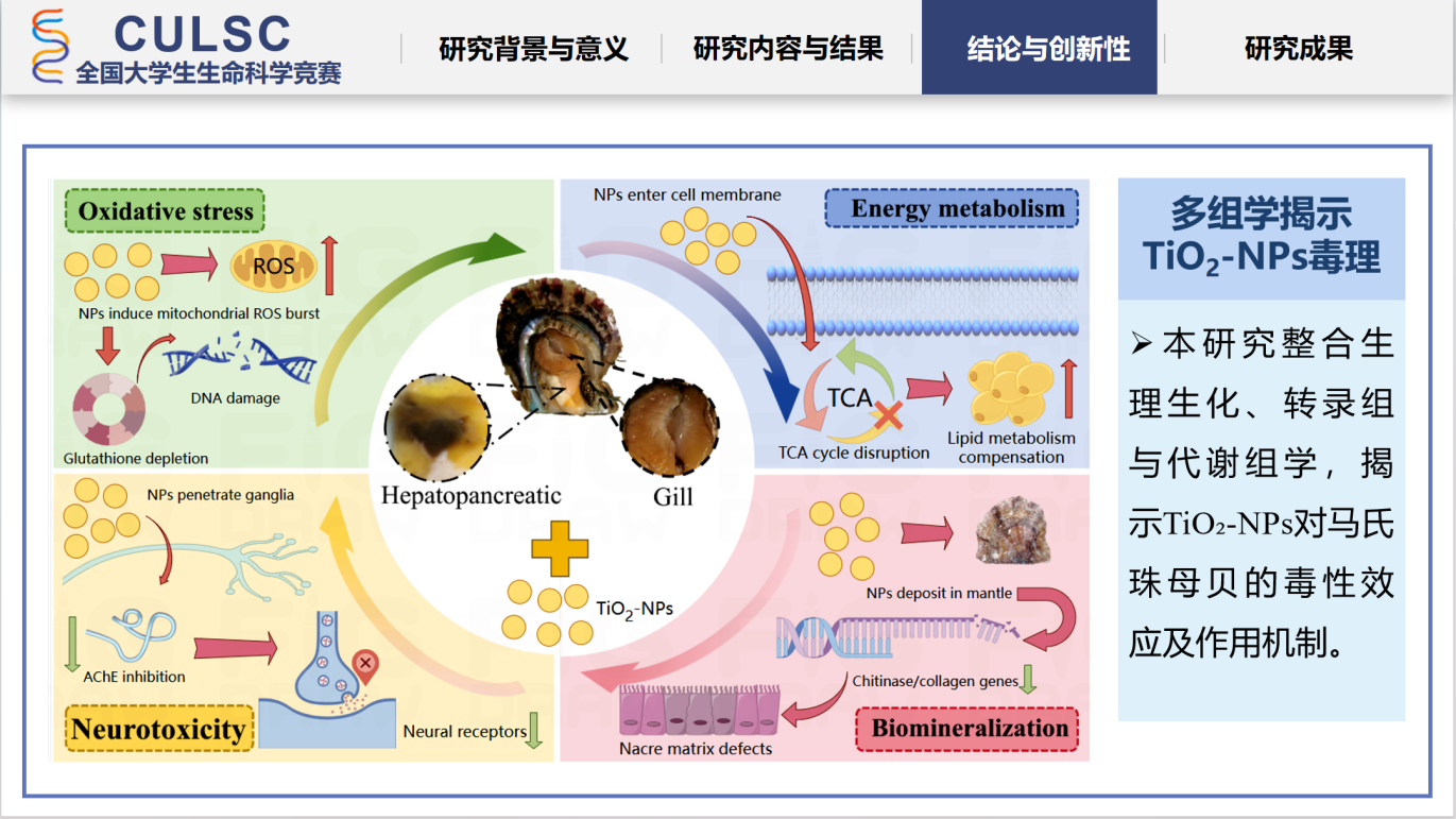 本届竞赛自2025年1月启动,历经网络评审和全国总决赛两个阶段。全国总决赛中,水院学子以出色的专业能力和创新思维获得认可。由邹鹤麒、刘家恩同学主持的参赛项目《纳米二氧化钛胁迫下马氏珠母贝的多组学响应机制:代谢组与转录组整合分析》(指导老师:杨创业、廖永山)荣获全国一等奖,该项目凭借新颖的创新点,优秀的论文成果和出色的现场汇报与答辩,赢得了评审专家们的高度评价。